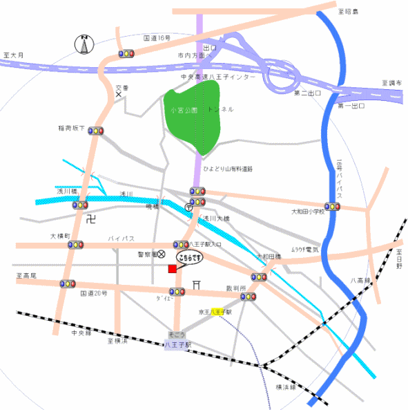 @都心方面より→→→八王子第一インター出口で降りる→→→3つ目の信号(大和田小学校)を右折→→→